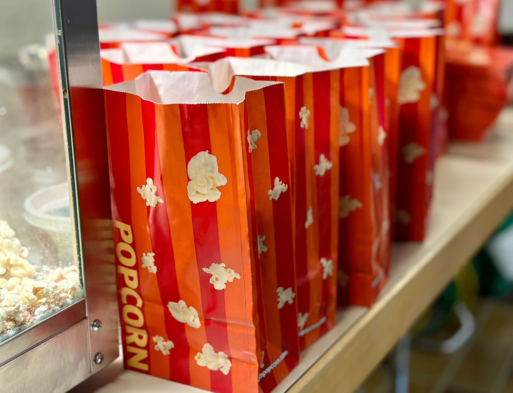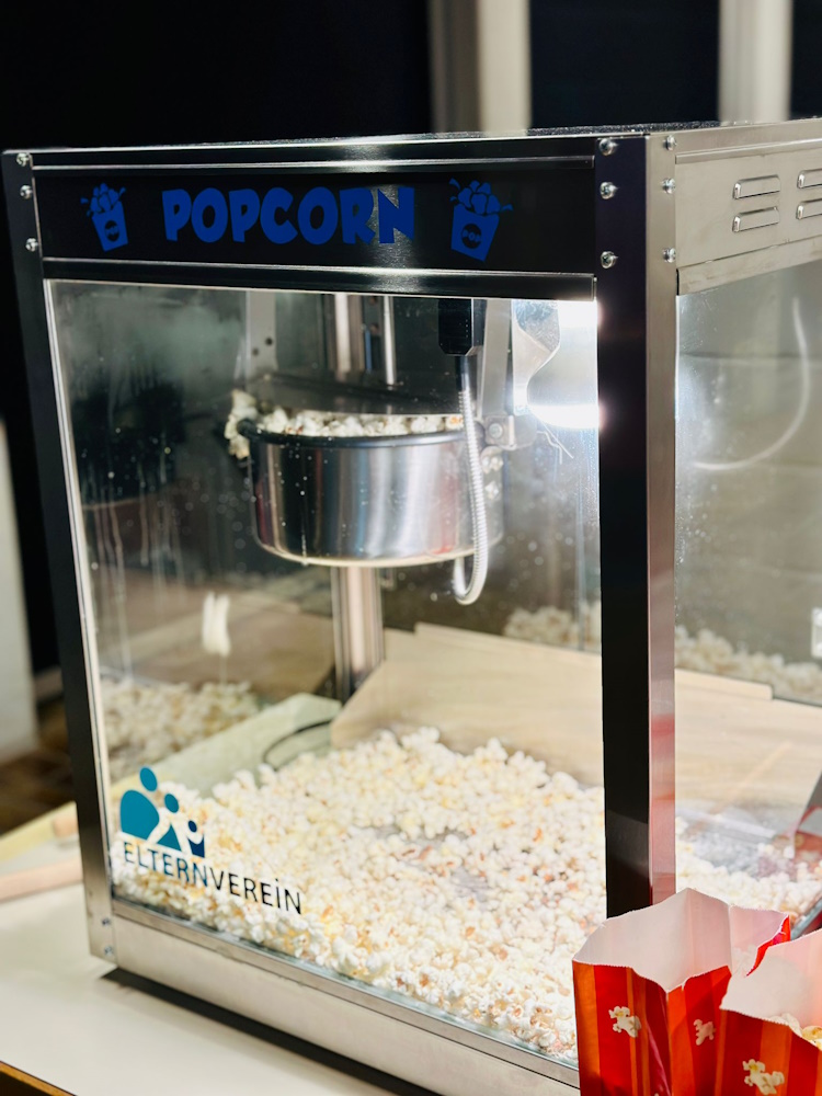 Bereits um 16 Uhr wurde die Popcornmaschine aufgeheizt, damit bei Filmbeginn um 18 Uhr für jedes der 42 teilnehmenden Kinder ein Säckli Popcorn bereitstand. Auch die Turnhalle Kirchdorf wurde ab diesem Zeitpunkt zum Kinosaal umgewandelt.