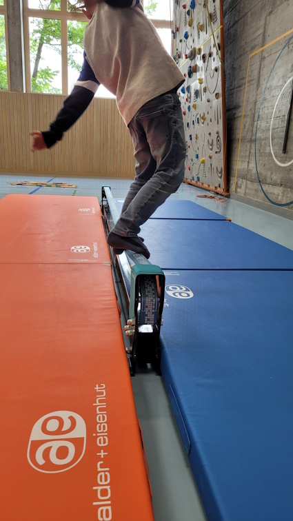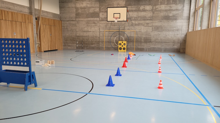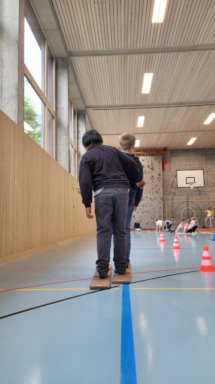 Den ganzen Nachmittag konnten sich die Kinder an den gemieteten Bewegungs- und Spielgeräten austoben. Auf dem Schulhausplatz wurden viele Runden auf den verschiedensten Fahrzeugen gedreht, das Riesensprungseil sorgte für viele Hüpfer und die Würfe mit dem Diabolo konnten immer sicherer durchgeführt werden. Auch in der Turnhalle war das Körpergefühl der Kinder gefragt: das Gleichgewicht auf Slackline und Balancebrett, Zielgenauigkeit bei den verschiedenen Wurfspielen und Geschicklichkeit beim Sackhüpfen und Grasski laufen.