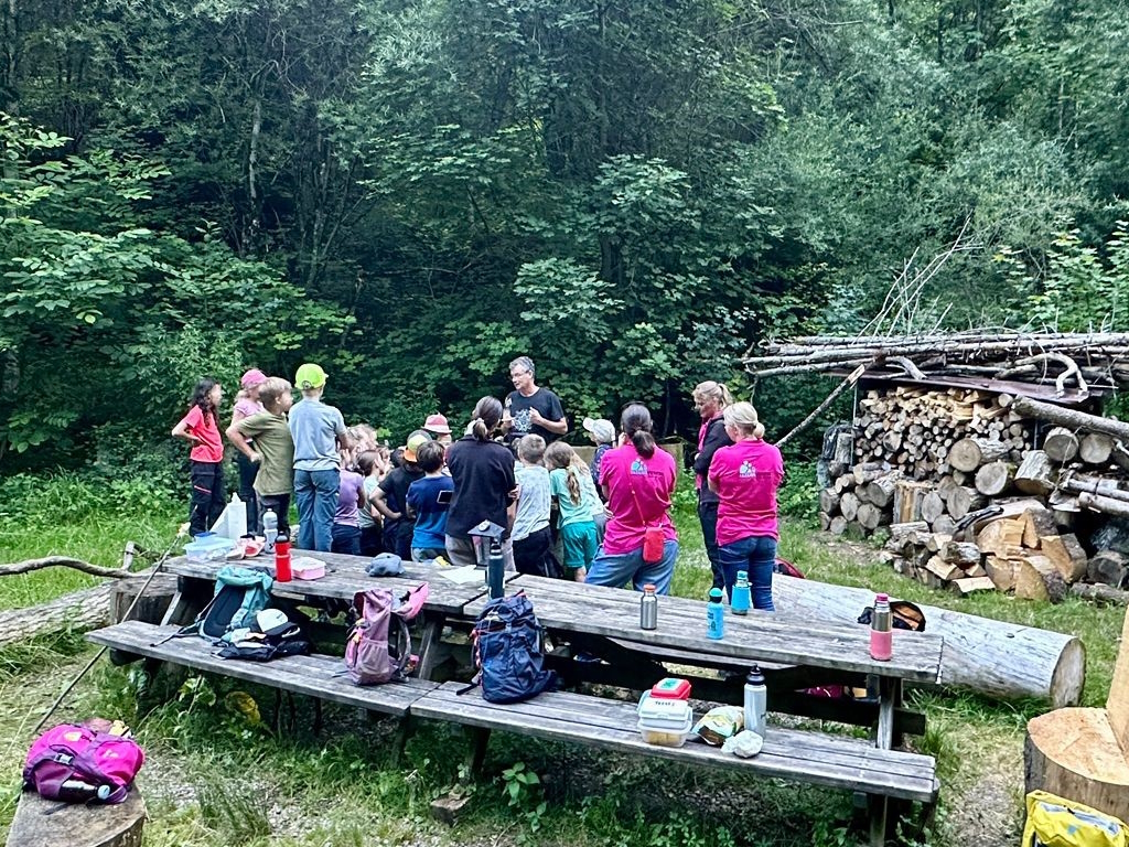 Der Abend war noch jung und bei der Ankunft bei der Brätlistelle im Wald folglich noch zu hell, um Fledermäuse zu beobachten. Deshalb haben wir die Zeit mit einem Rundgang durch den Zwergenwald, freiem Spiel, Fledermausgeschichten, rätseln und bräteln vertrieben. Rob hat uns in dieser Zeit mit vielen Informationen über Fledermäuse versorgt und dies mit Anschauungsmaterial, wie ausgestopften Fledermäusen, noch greifbarer gestaltet.