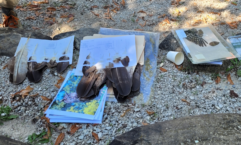 Die Kinder wurden in drei Gruppen eingeteilt und den drei Spezialisten zugewiesen, von denen jeder ein anderes Thema mit den Kindern bearbeitete. Bei Brigitte durften die Kinder einen Glasuntersetzer mit einem Adlerbild bemalen und diesen mit nach Hause nehmen. Anja hat mit den Kindern verschiedene Vogelspiele gespielt, und damit den Bewegungsdrang der Kinder gestillt. Philipp versorgte die Kinder und uns Erwachsenen mit vielen spannende Fakten über unsere einheimischen Vögel. Das Anschauungsmaterial in Form von Federn, Flügeln und Büchern wurde mit grossem Interesse inspiziert.