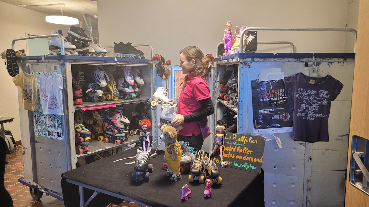 Damit es eine «richtige» Rollerdisco wurde, durften die Rollschuhe wie in den 80ger-Jahren nicht fehlen. Wir haben in Chrigu alias le-rolljulien einen richtigen Rollschuh-Freak gefunden, welcher mit seinen zwei Wagen voller Miet-Rollschuhen wie früher vor Ort war und sein Können und seine Tipps und Tricks an Jung und Alt weitergegeben hat.