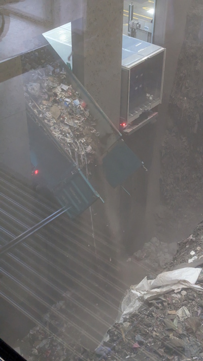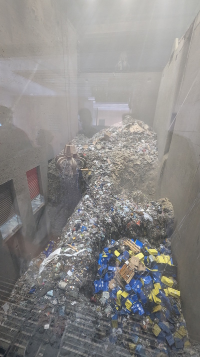 Vom Brennofen, vorbei an den verschiedenen Luft-Filteranlagen bis ganz hoch aufs Dach (mit traumhaft schöner Aussicht), zurück durch weitere ausgeklügelte Reinigungsanlagen – damit keine Schadstoffe ins Abwasser gelangen – bis hin zur Kommandozentrale. Ganz zum Schluss kam einer der eindrücklichsten Stellen des Rundgangs: der wirklich gigantische Raum, in welchem der angelieferte Müll gesammelt, durchmischt und dann verbrannt wird. Alles gesteuert durch den Kranführer, der mit Hilfe vieler Überwachsungsbildschirme die riesige Kralle bedient.