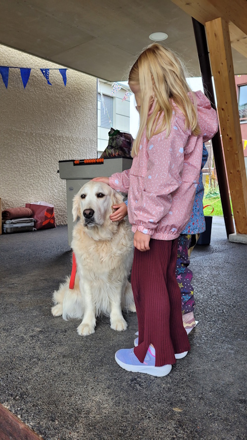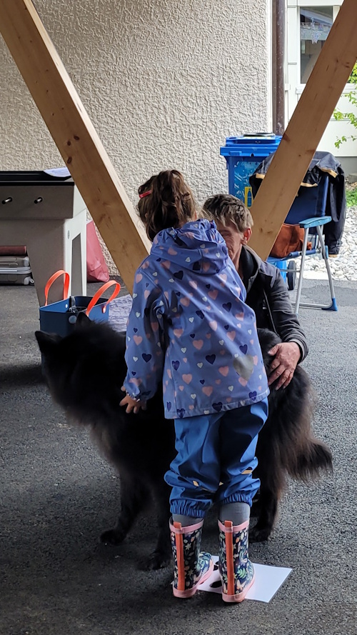 Roland Haller zeigte den Kindern mithilfe eines kleinen Kasperlitheaters und Rollenspielen die wichtigsten Verhaltensregeln, welche es im Umgang mit fremden Hunden zu beachten gibt. Diese konnten die Kinder sogleich mit den Hunden Eve und D’Django üben. Zum Abschluss gab es ausgiebige Streicheleinheiten für die beiden geduldigen 4-beiner.